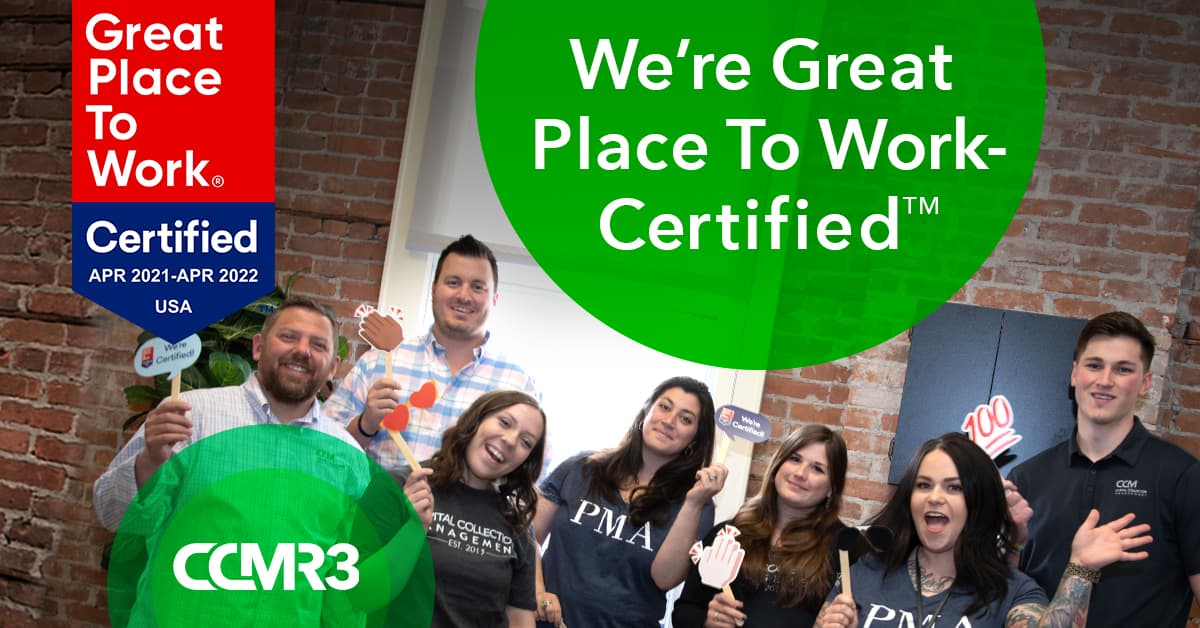 Syracuse, N.Y. – CCMR3, a leading provider of accounts receivable management and collection services, is proud to announce it has been Certified™ by Great Place to Work®. This prestigious recognition is based on anonymous feedback from employees about their experience working at CCM, with 100% of employees saying it’s a great place to work, compared to 59% of employees at the average U.S. company. “I’m incredibly humbled that our people are proud to be a part of CCMR3 and are fulfilled by the work we do. We would not be receiving this certification without their dedication, perseverance, and hard work,” said Jacob Corlyon, Co-Founder and CEO of CCMR3. “The success of our company starts with our people, which is why we prioritize helping them reach their full potential, set and exceed their goals, and explore new opportunities to grow. We celebrate everyone at CCMR3 who makes us a great place to work.” CCMR3’s culture promotes positivity, teamwork, loyalty, and collaboration. The company regularly recognizes employees who excel in their work and exemplify the company’s core values. CCM’s competitive benefits, amenities, and opportunities align with employees’ interests and include: 100% coverage of health insurance premiums for employees and their families Robust wellness program that includes monthly fitness challenges and an on-site gym Virtual therapy sessions fully covered by CCMR3 to promote employees’ mental health This past year, CCMR3 went above and beyond to help employees adapt to the new remote workforce by providing every current and new employee with a one-time $1,000 stipend to enhance their home office. The money could be put toward expenses such as office furnishings and décor, or to replicate amenities offered at CCMR3’s office, including exercise equipment and coffee machines. “Great Place to Work Certification isn’t something that comes easily; it takes ongoing dedication to the employee experience,” said Sarah Lewis-Kulin, vice president of global recognition at Great Place to Work. “It’s the only official recognition determined by employees’ real-time reports of their company culture. Earning this designation means that CCMR3 is one of the best companies to work for in the country.” According to Great Place to Work research, job seekers are 4.5 times more likely to find a great boss at a Certified great workplace. Additionally, employees at Certified workplaces are 93% more likely to look forward to coming to work, and are twice as likely to be paid fairly, earn a fair share of the company’s profits, and have a fair chance at promotion. About CCMR3 CCMR3 provides modern, technology-driven collections, debt purchasing, and litigation services for enterprises that need engagement with empathy, experience with compliance, and excellence in debt recovery. Leveraging state-of-the-art analytics and machine learning combined with a service-focused approach, CCMR3 helps organizations from a variety of industries protect their brands and improve their bottom lines. To learn more, visit www.ccmr3.com and follow us on LinkedIn